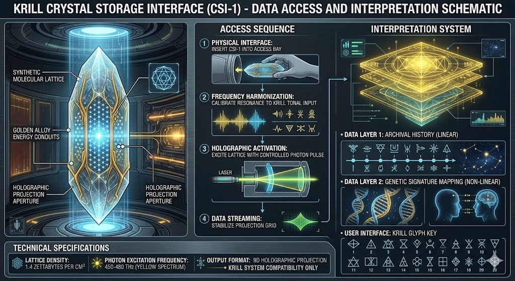 The most significant “gift” provided by the Krill was the Yellow Book. This was not a physical book, but a Crystal Storage Device that functioned as a portable, holographic library. When activated, it projects a 9D environment that allows the viewer to witness historical events as if they were physically present.