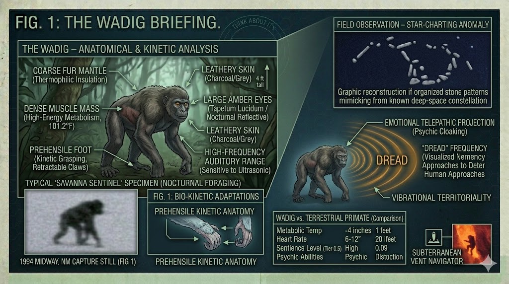 ![Technical schematic composite for [Think About It Alien Database] detailing Wadig (African Primate-Humanoid) anatomy and special features. Clockwise from left: The Savanna Sentinel entity; FIG. 1 Bio-Kinetic Adaptations; Emotional Telepathic Projection graphic; Star-Charting Anomaly diagram; and Subterranean Vent Navigator icon.](https://thinkaboutit-aliens.com/wp-content/uploads/2025/08/unnamed-2026-03-04T104222.682.jpg)
