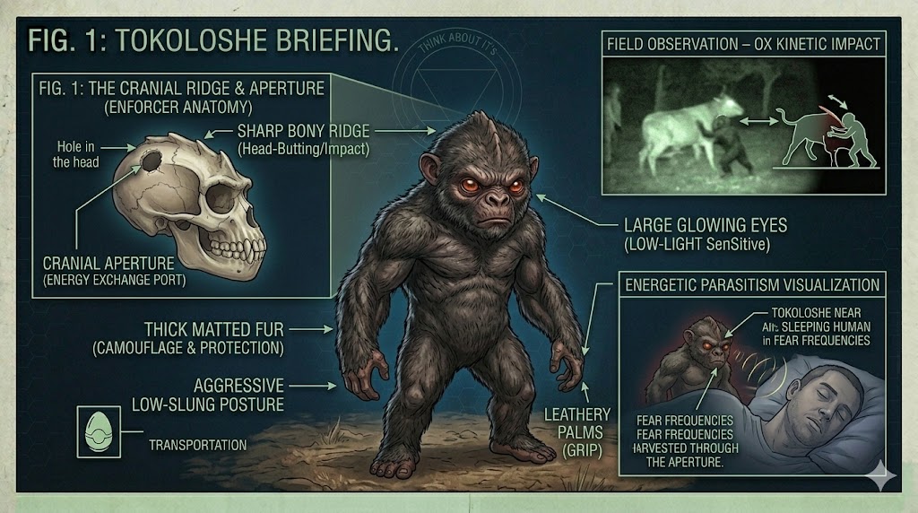 It is believed that the cranial hole allows the entity to “inhale” the emotional frequencies of fear and terror. This makes the Tokoloshe a symbiotic partner to other parasitic races; it generates the fear through physical harassment, and then harvests that energy for its own metabolic needs. This biological energy-transfer system explains why the entity is so difficult to capture or kill—it is often partially phased between densities during the feeding process.