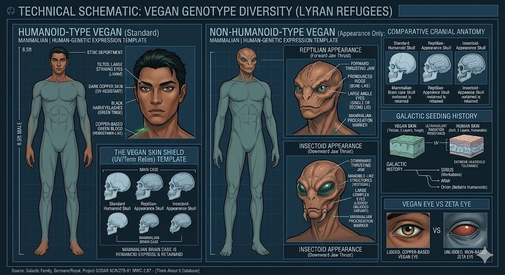 ![Comparison diagram in the [Think About It Alien Database] clinical aesthetic visualizing the standard Humanoid-Type Vegan alongside the Non-Humanoid-Type variants (Reptilian-look, Insectoid-look), emphasizing their unified mammalian genetics. Labeled details cover: large lidded striking eyes; dark copper, UV/temp resistant skin; black hair (green tinge); copper-based green blood (sturdy metabolism); forward and downward jaw thrusts; and mammalian procreation. The entire chart is presented on a dark briefing screen with medical grid lines. Source: Project GODAR (NCR/27B-01 MWC-2.B7).](https://thinkaboutit-aliens.com/wp-content/uploads/2025/08/unnamed-2026-03-04T133914.088.jpg)